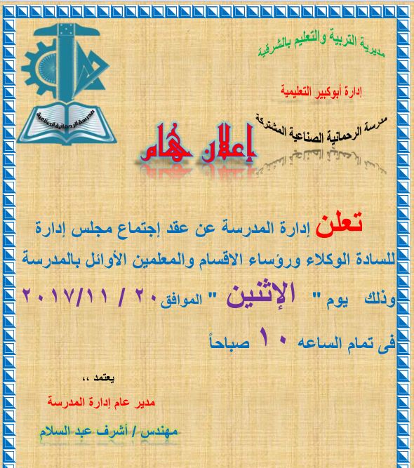 إعلان هام غدا إجتماع لمجلس الإدارة موقع مدرسة الرحمانية الصناعية الإخباري