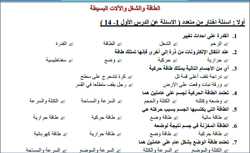 اسئله عن الشغل والطاقه والالات البسيطة للصف السادس الفصل الاول منتديات صقر الجنوب
