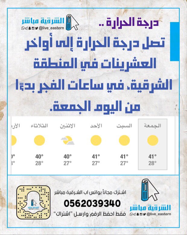 سناب الشرقية حسن العمري على تويتر تصل درجة الحرارة إلى أواخر العشرينات في المنطقة الشرقية في ساعات الفجر بدء ا من اليوم الجمعة الشرقية مباشر