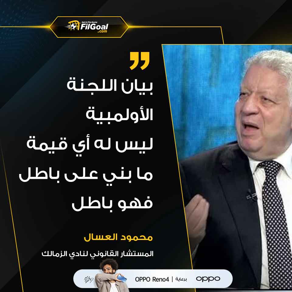 في الجول المستشار القانوني للزمالك عبر قناة النادي بيان اللجنة الأولمبية ليس له أي قيمة ما بني على باطل فهو باطل